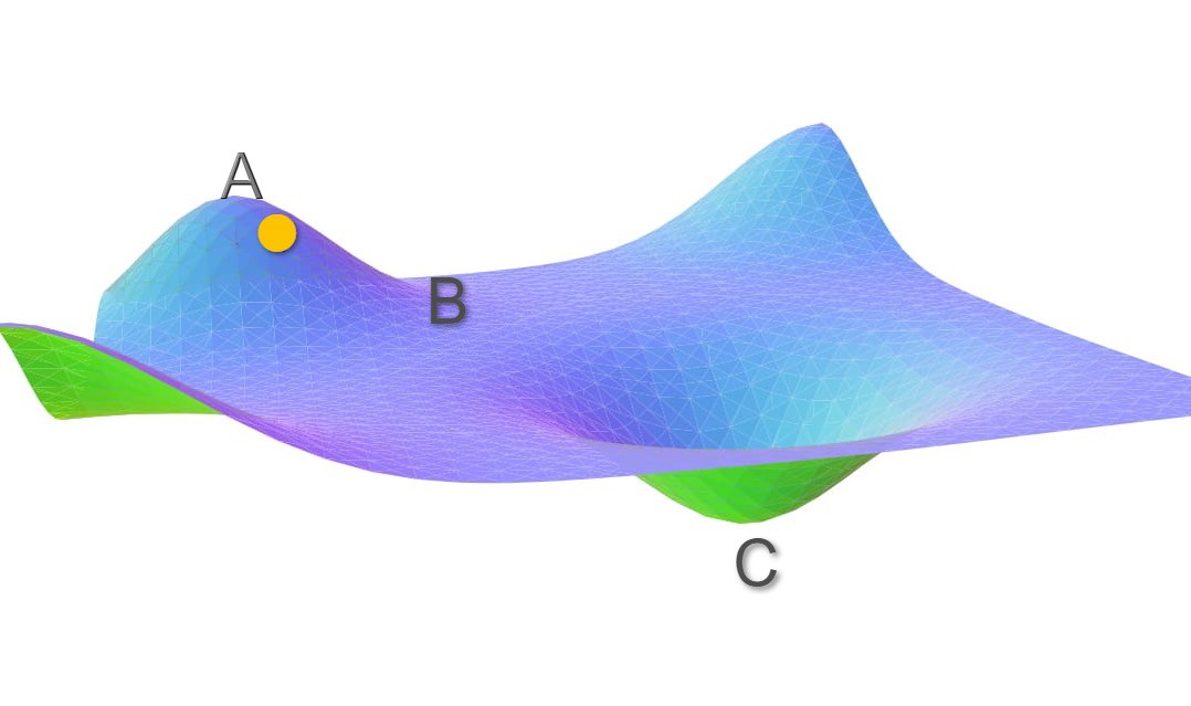이제 point A로부터 공이 굴러간다고 상상해보자. 공이 천천히 굴러가기 시작하고, AB 경사면에서 momentum을 수집한다. 공이 B 포인트에 도달했을 때, 공은 충분한 모멘텀(momentum)을 모은 상태이며, 모멘텀으로 B 포인트를 벗어나 BC 경사면으로, global minima인 C 포인트까지 도달할 수 있다.