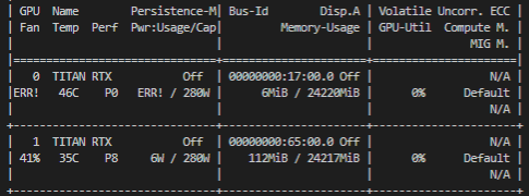 헉 0번 GPU 상태가 이상하다! GPU Fan, Pwr Usage에서 Error가 생겼다. 구글 서치를 해보니 팬을 청소해라, reboot해라 등의 해결 방안들이 있었다.