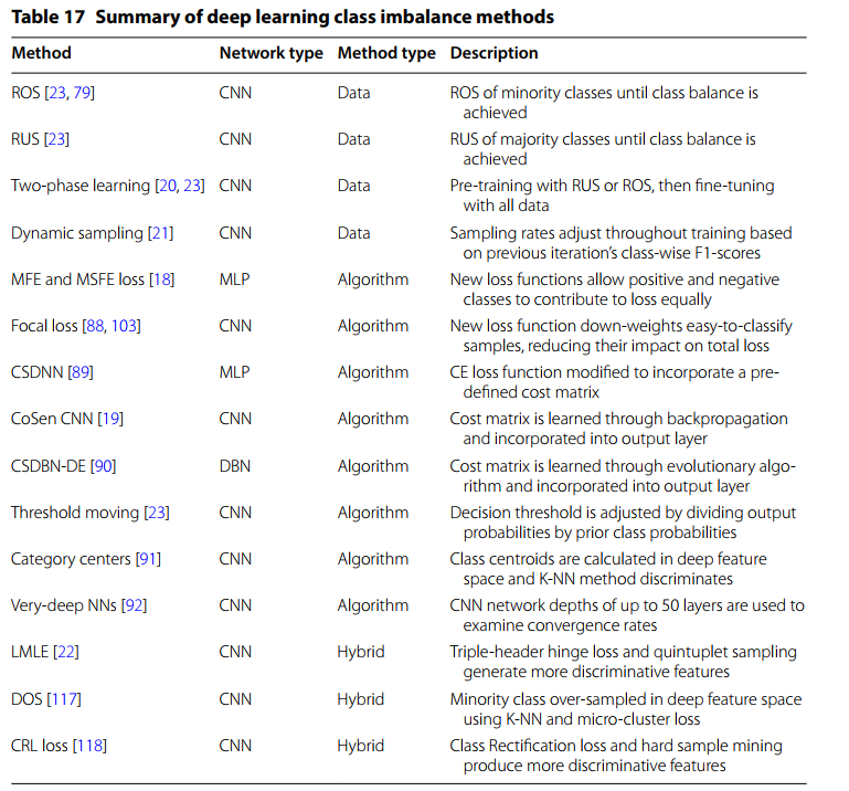 class imbalance를 다루기 위해서 기존의 머신 러닝 기법들을 넘어서 딥러닝 기법들이 적용되어 왔다. 이에는 random sampling, informed sampling, cost-sensitive learning, thresholding, hybrid method가 해당된다.