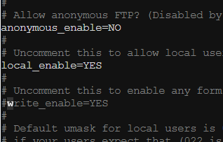FTP 서버가 업로드를 허용하도록 하려면 FTP 서버 설정 파일을 열어서 주석 처리된 몇몇 옵션들을 풀어줘야 한다.