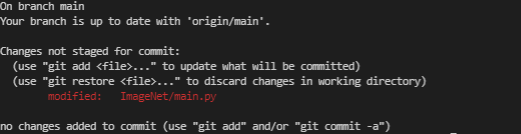 git add로 staging area에 올라간 파일들 초록색으로 표시. 수정/삭제/추가의 여부도 앞에 modified:와 같이 표시된다.